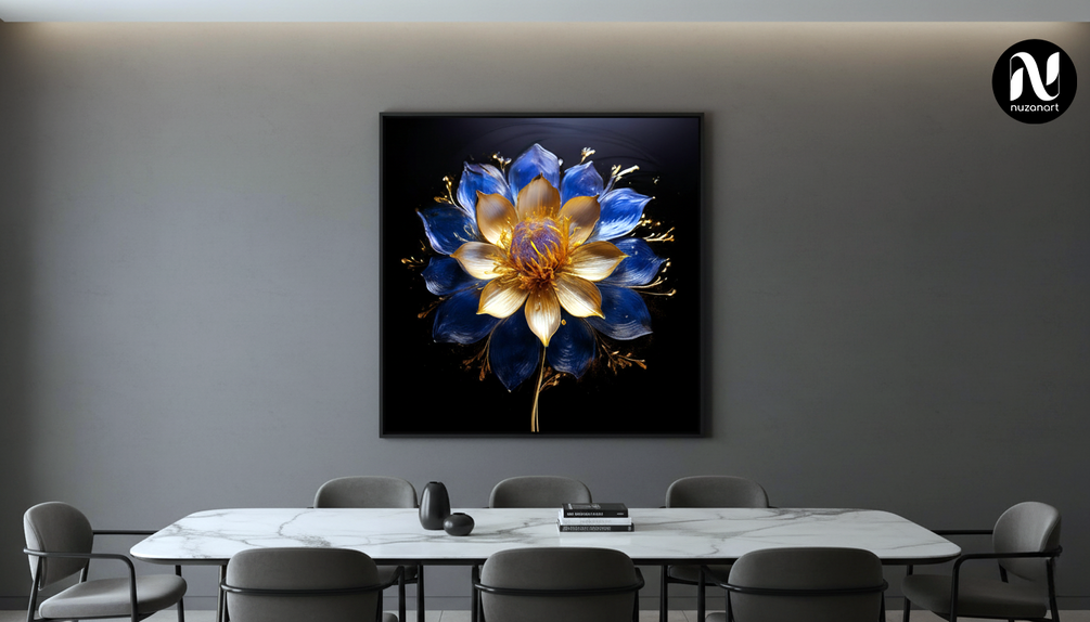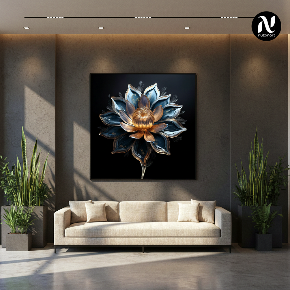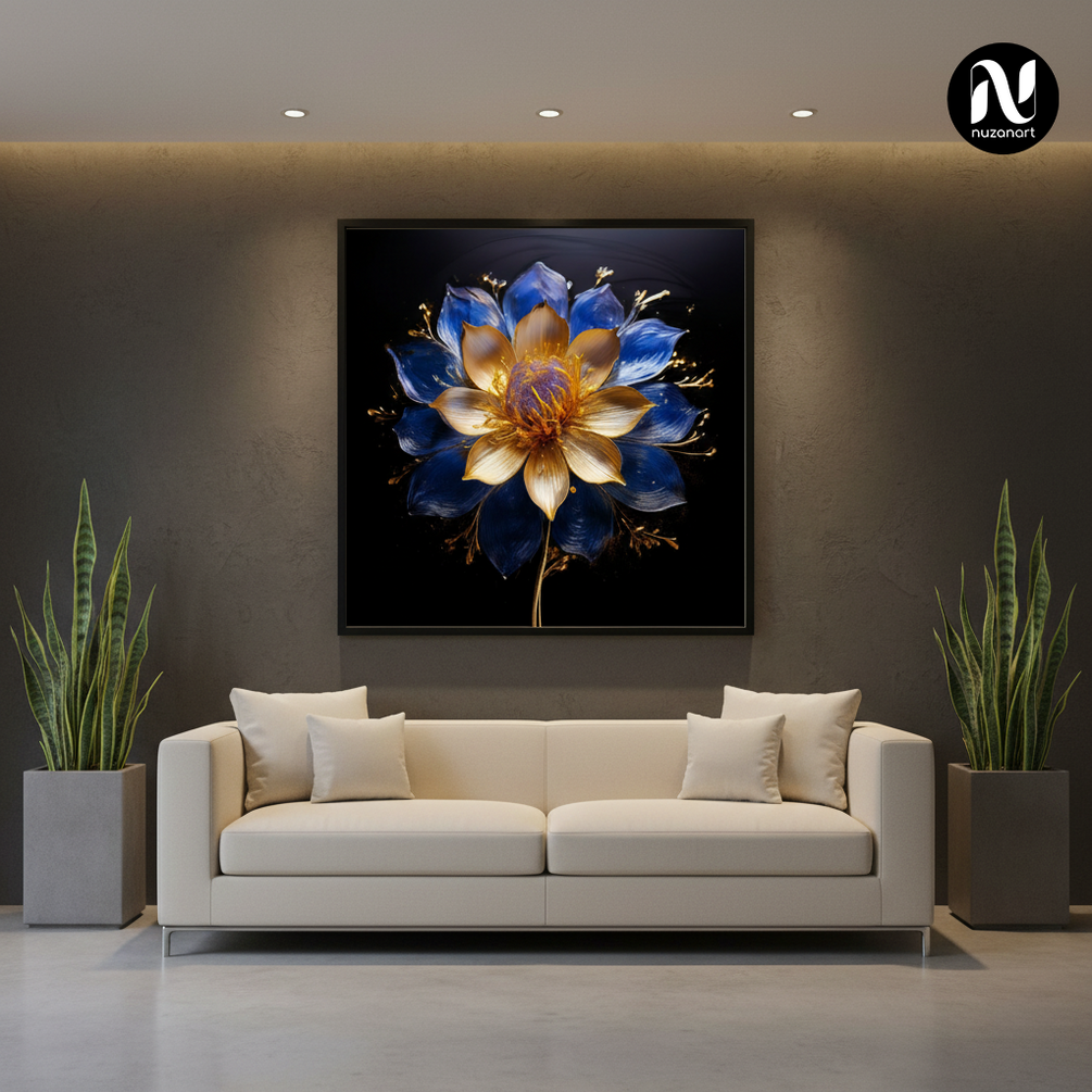 Each artwork features a meticulously detailed flower with glowing petals, golden accents, and a deep black background — creating a rich, dramatic, and calming visual impact. Designed to elevate interiors, these artworks blend modern minimalism with luxury aesthetics.