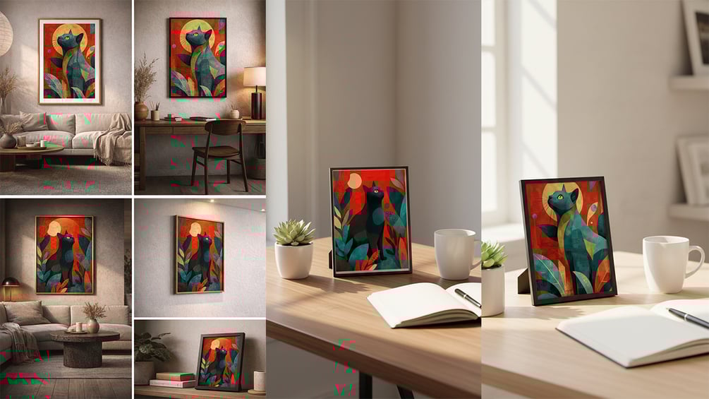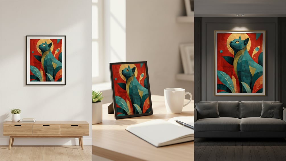 Celestial Cat is a modern abstract cat wall art designed to elevate home, office, and studio spaces. Featuring bold colors and a contemporary boho aesthetic, this high-resolution 6k digital artwork is perfect for wall frames or table-top displays and is available for both personal and commercial use.